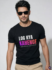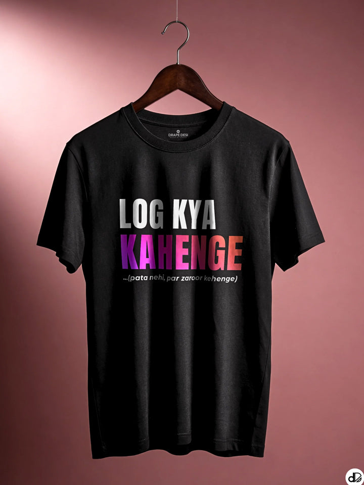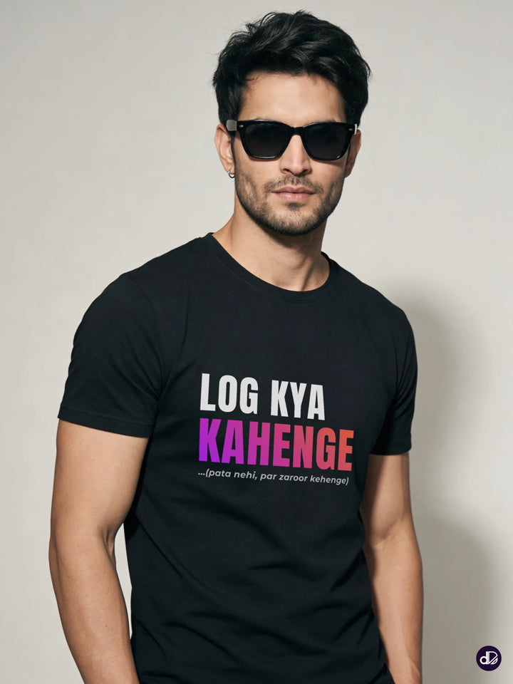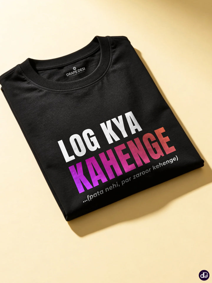 Own the narrative before anyone else can start it. This design takes the ultimate Indian societal pressure cooker—"Log Kya Kahenge"—and flips it into a bold statement of indifference. By adding the cheeky "pata nahi, par zaroor kehenge" subtext, this tee acts as a stylish armor against unwanted opinions. The vibrant gradient on the typography breaks the monotony of the black fabric, making it a perfect conversation starter for the man who is done living by everyone else's rules.